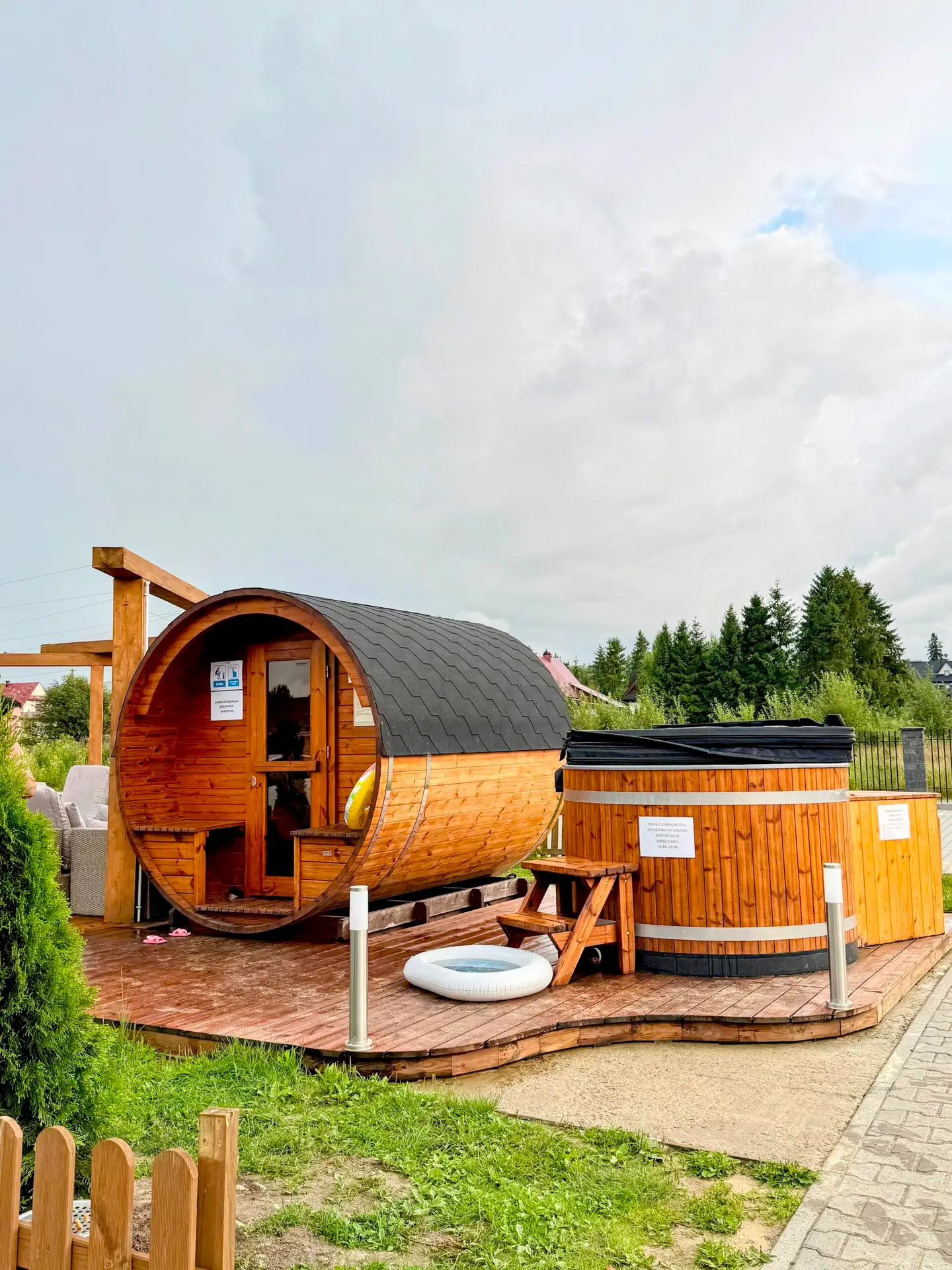 Skorzystaj z sauny zewnętrznej z balią z zimną wodą lub wewnętrznej sauny suchej ze strefą relaksu